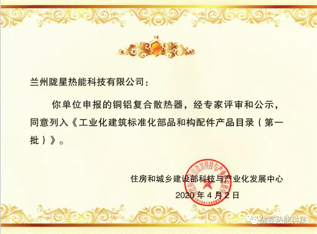 除此之外,隴星7月也是一路乘風破浪,載譽前行。根據《國務院辦公廳關于大力發展裝配式建筑的指導意見》(國辦發〔2016〕71 號)文件精神和《工業化建筑標準化部品和構配件應用指南》相關要求。隴星熱能科技公司于今年5月提交有關申報材料,經住房和城鄉建設部科技與產業化發展中心組織專家評審,隴星熱能科技公司銅鋁復合散熱器被列入《工業化建筑標準化部品和構配件產品目錄(第一批)》。