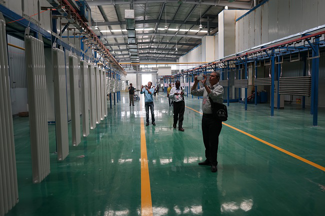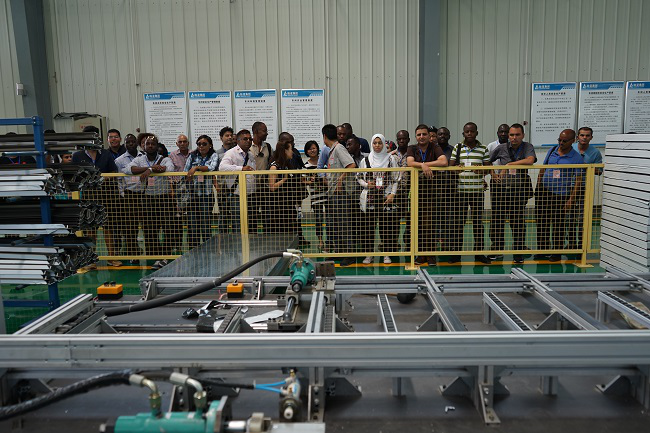 在集團(tuán)公司總裁吳繼祖陪同下,參觀團(tuán)先后深入到廠房和制造車間,對(duì)生產(chǎn)環(huán)境、工藝流程、主要設(shè)備、人員配備情況等進(jìn)行了參觀和了解。參觀團(tuán)一行對(duì)我公司新研發(fā)的輕型散熱器、平板集熱器、熱電聯(lián)產(chǎn)、PIC抑制熱傳導(dǎo)生產(chǎn)線等進(jìn)行了現(xiàn)場(chǎng)觀摩。他們?cè)谌轿涣私夤镜囊?guī)模實(shí)力、研發(fā)實(shí)力及詳細(xì)的產(chǎn)品介紹后,高度贊揚(yáng)了公司產(chǎn)品的質(zhì)量和創(chuàng)新研發(fā)能力,對(duì)我公司的產(chǎn)品產(chǎn)生較大的興趣并期望今后與我公司能有合作機(jī)會(huì)。